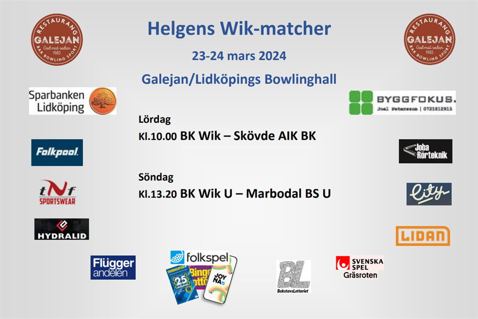 Med endast fyra matcher kvar av säsongen är det hemmamatch igen på lördag, efter förra veckans lyckade bortaresa. Nu kommer Skövde AIK på besök till Lidköping och vi vill gärna ha ditt stöd i hallen. Wik ligger ju i skrivande stund i topp i tabellen, 2 poäng före andraplacerade LC17 som vi kommer möta i Lidköping i nästkommande omgång den 6 april. På söndag spelar övriga Wik-lag där F-laget har bortamatcher mot Gärdet och BK 64 i Mariestad, medan U-laget spelar hemma mot Marbodal. Vårt kombinerade B-lag har också bortamatcher fast i Mellerud och Ed. Vi önskar alla lag lyck till! Här är tiderna för alla helgens Wik-matcher… Lörd. 23/3 kl.10.00 BK WIK - Skövde AIK BK i Lidköping Sönd. 24/3 kl.10.00 BK Gärdet - BK WIK F i Marieastad Sönd. 24/3 kl.11.40 BK 64 F - BK WIK F i Mariestad Sönd. 24/3 kl.13.20 BK Wik U - Marbodals BS U i Lidköping Sönd. 24/3 kl.10.00 BK Håvås B - BK Lidex/Wik/Alley B i Mellerud Sönd. 24/3 kl.15.30 KS Edsbowlarna B - BK Lidex/Wik/Alley B i Ed BKWIK 20 mar 2024 0kommentarer