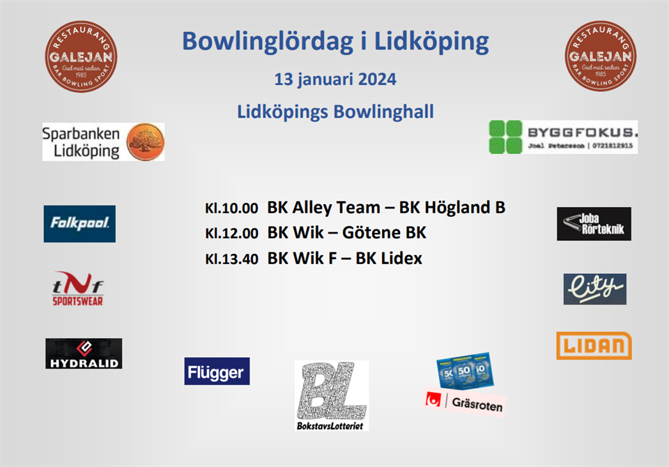 Lördagen den 13 januari drar serien igång igen, och då med dubbla derbymatcher i Lidköping. Dagen startar kl.10.00 med match mellan BK Alley Team som har BK Högland B på besök. Kl.12.00 blir det en viktig match i toppen av division 2 då BK Wik tar emot Götene BK. Denna följs sedan kl.13.40 av BK Wik F som möter BK Lidex. Vi hoppas på bra stöttning i hallen, och i samband med A-lagets derbymatch mot Götene bjuds alla ungdomar i Wik U som kommer och hejar iförd Wik-tröja, av klubben på läsk och chips! Vi hälsar alla föräldrar, medlemmar och övriga supportrar mycket välkomna att heja! Välkommen till Lidköpings Bowlinghall / Galejan!