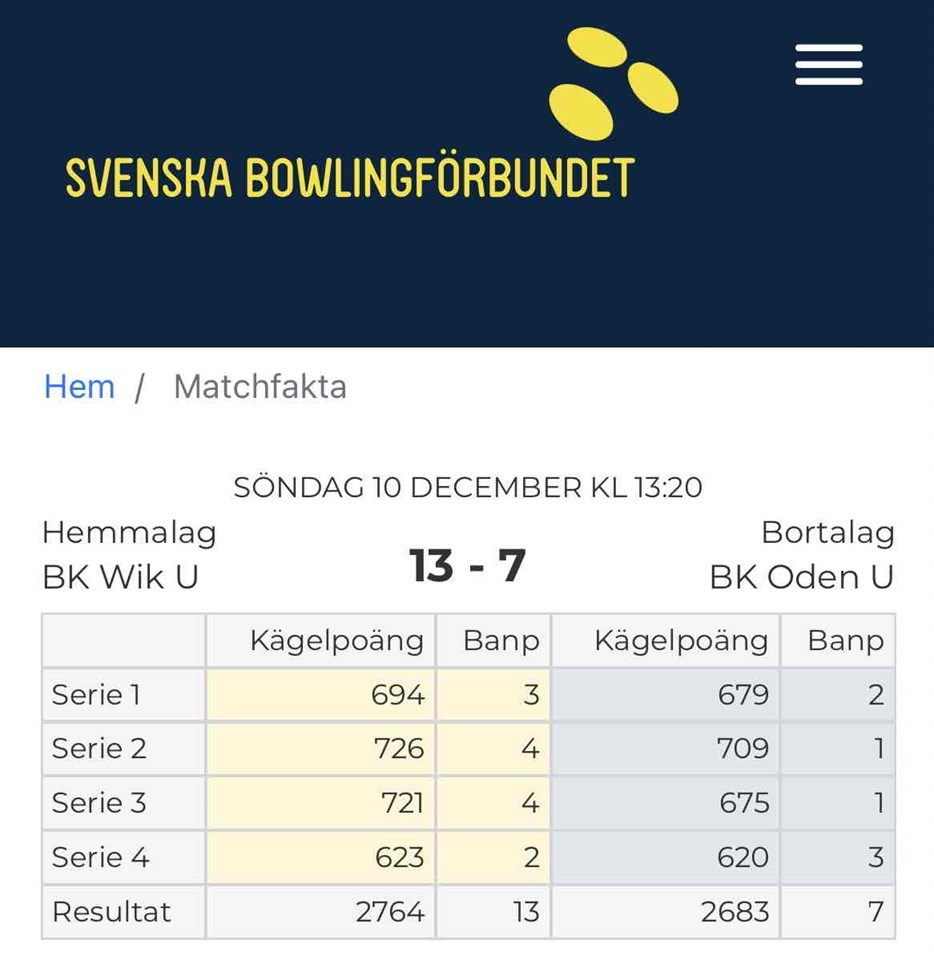 I dagens hemmamatch besegrade våra duktiga ungdomar Oden från Falköping med 13-7! Stabila tre första serier med en liten dipp i sista men då var matchen redan vunnen. Snygg första serie av Lukas Löfberg: 208! BKWIK 10 dec 2023 0kommentarer