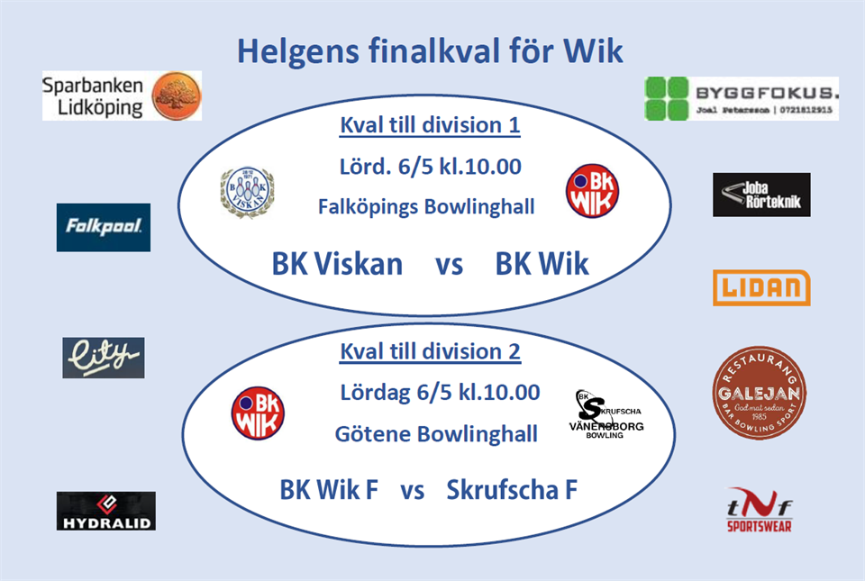 Nu är alla tider och platser fördelade för att spela det avgörande kvalet för BK Wik A- och F-lag. Tyvärr har förbundet lagt in kvalet samma dag och samma tid för de båda lagen, vilket är nu på lördag den 6 maj, med start för de första matcherna kl.10.00. Dock är det inte lika långt att åka denna gång så vi hoppas du kommer och stöttar oss i någon av hallarna. För A-laget är motståndaren BK Viskan, och spelplatsen är Falköpings Bowlinghall, och för F-laget är det BK Skrufscha F som är motståndare och denna kamp utspelar sig i Götene Bowlinghall. På samma sätt som den gångna helgen gäller det bäst av tre matcher, där en ev. tredje avgörs i enda serie. Naturligtvis går det också att följa oss via mobil/dator. Klicka på respektive match för att komma till Live Scoring. BK Viskan – BK Wik i Falköpings Bowlinghall BK Wik F – BK Skrufscha F i Götene Bowlinghall