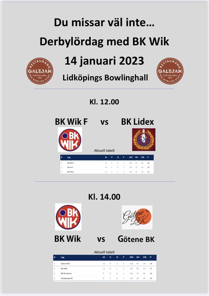 Så var då juluppehållet över. Först ut var Farmen som tog emot Lidex, som vi förlorade mot senast. Om det var det, eller julvilan som satt i benen i första serien är oklart. Svag start i alla fall och underläge 1-4! Sen tog Wik tag i matchen i andra och via 1628 tog man en snygg 5-0a. Trögare igen i tredje men vi lyckas hålla två bord, och tar även totalen. Ledning således med 9-6 inför sista, som blev oerhört jämn! Tillslut lyckas Wallin/Pontus och Fredrik/Lilja stänga sina bord, totalen med 1 pinne till Lidex men vad gör det när vi vinner med 11-9! Bäste Wikare Fredrik Tengelin med storfina 889. Guldpeng även till Anders Wallin och Lars Liljeqvist A-laget ut sedan mot serieledande Götene. Även denna match skulle bli mycket jämn. Stenhårt i första serien där Wik tillslut lyckas knipa tre bord men tappar ändå totalen. Bättre fart på Wikarna i andra serien också i denna match, och man har länge 5-0 på gång, men tappar i sista rutan till 4-1. Till skillnad mot F, håller man ångan oppe även i tredje och stänger matchen via 4-1. Som så många gånger när matchen är klar tappar man fokus, så sista skrivs till 0-5, men viktigast är ju seger med 11-9! Jan Nordberg som saknades innan jul pga sjukdom visade än en gång att gammal är äldst. Gedigna 936 imponerar! Även Maths Blyh, Tomas Elofsson och Andreas Wik över 800-strecket Kul med mycket folk i hallen båda matcherna, och ger energi för nästa helg då A möter Team Mariestad F, och Farmen tar sig an Kvänum F #återtåget #läckert