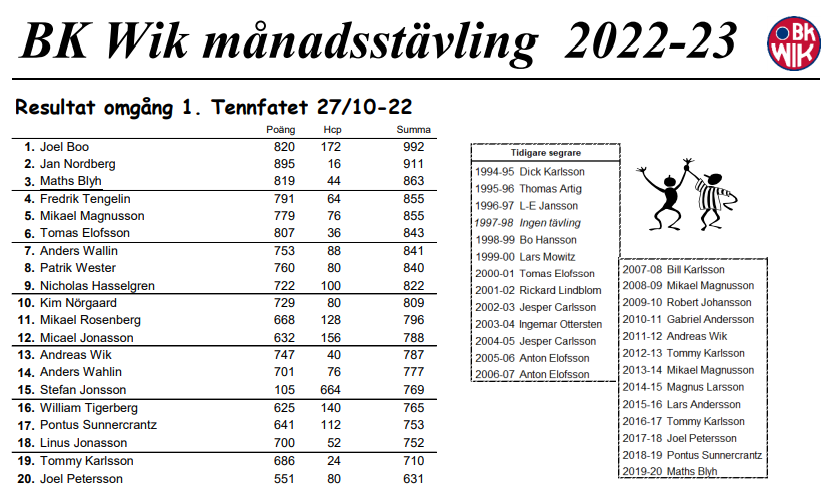 Månadstävlingarna är åter i gång efter Coronapandemin, och det var stor uppslutning denna torsdag. 20 spelare kom till start och med en sparring blev det tre man per bana. Tävlingen spelas som tidigare och innebär deltävlingar där man samlar poäng under fem tillfällen, som sedan slutar i en final för de 8 bästa med flest insamlade poäng. Denna gång spelade vi om Tennfatet som spelas med hcp, och med totalpoängen 992 blev Joel Boo överlägsen segrare. På andra plats kom Jan Nordberg 911, och tredje Maths Blyh 863. Nästa månad blir det ny deltävling och då spelar vi den till Andreas Drotz minne, vilken spelas utan hcp. Mer info och resultat finns under Dokument-Klubbtävlingar 2022-23
